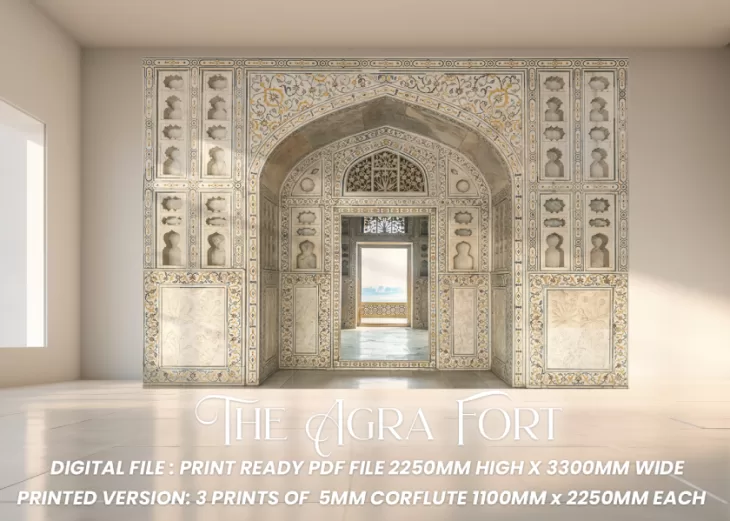 Transport your guests to the grandeur of Agra Fort with The Agra Fort Backdrop. This stunning design showcases the majestic architecture of the historic fort, featuring intricate marble inlays, delicate carvings, and regal archways. The rich textures and elegant details capture the essence of Mughal splendor, creating a striking setting for weddings, cultural events, and traditional ceremonies.