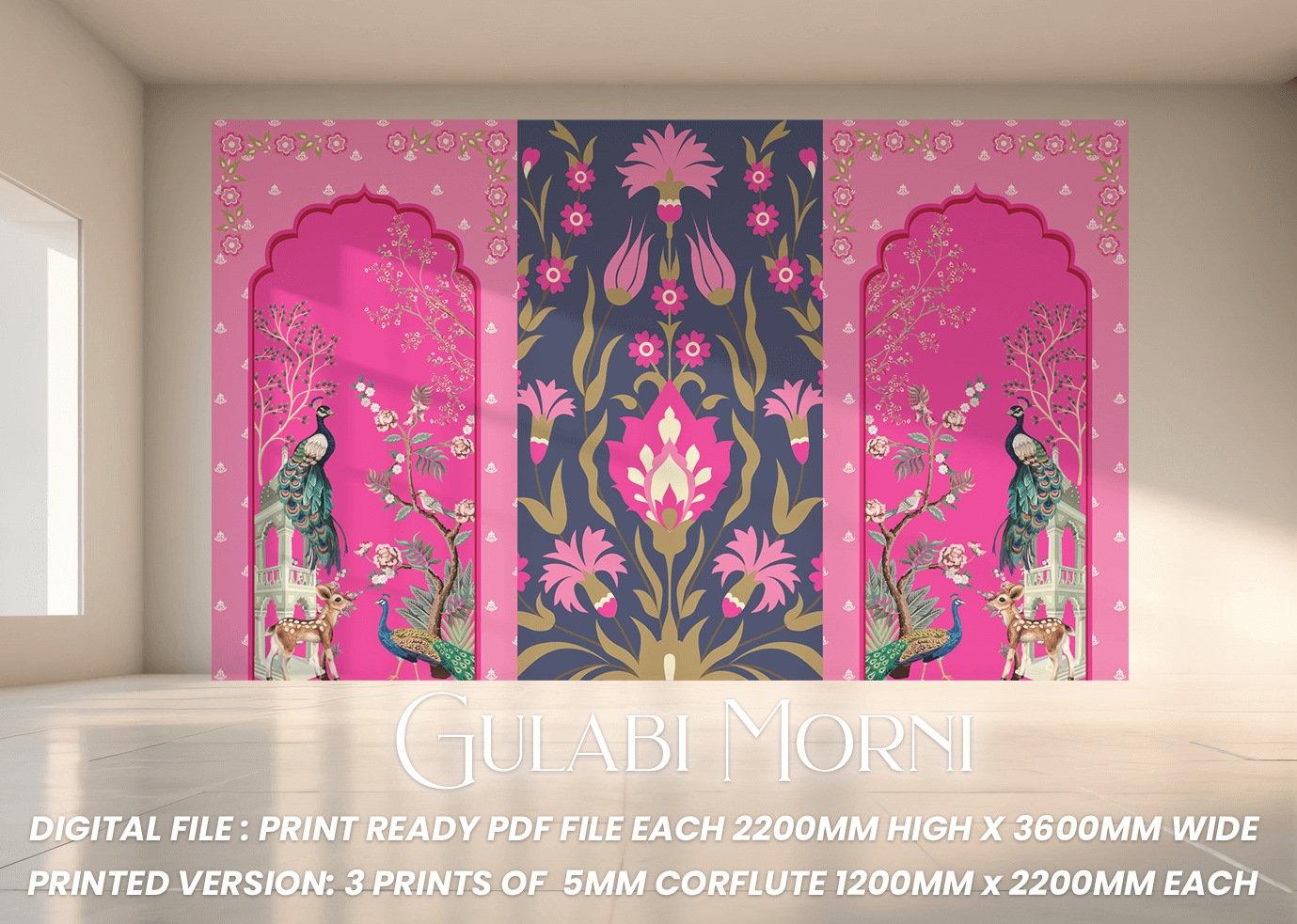 Step into a world of elegance with the Gulabi Morni Backdrop, a breathtaking fusion of traditional artistry and vibrant hues. Featuring majestic peacocks, delicate floral patterns, and intricate arch designs, this backdrop embodies the opulence of royal heritage. The striking combination of deep pink and navy tones, accented with golden motifs, creates a captivating visual experience, perfect for weddings, receptions, and cultural festivities.