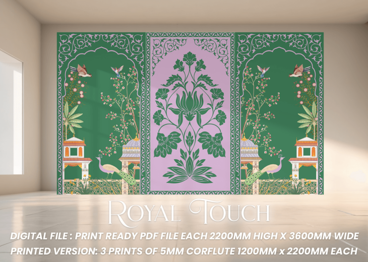 Exude grandeur and sophistication with the Royal Touch backdrop. This masterpiece draws inspiration from majestic royal palaces, featuring intricate patterns, ornate detailing, and a striking color contrast of emerald green and soft lavender. The elegant design symbolizes luxury and cultural heritage, making it perfect for traditional ceremonies, receptions, and regal-themed events. Printed on 3 flat panels (1100mm x 2200mm) with 300 DPI resolution, every detail stands out with sharp clarity, adding a regal flair to any occasion.