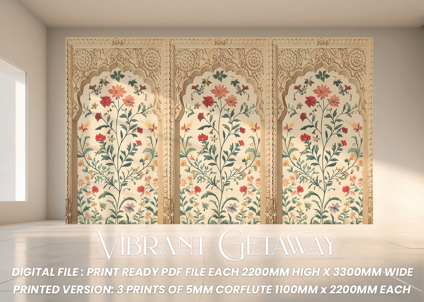 An exquisite blend of traditional artistry and intricate detailing, Vibrant Getaway showcases a lush floral motif framed by ornate golden archways. Inspired by regal Indian palaces, this design brings elegance and cultural depth to your special events. Perfect for weddings, receptions, and grand celebrations.