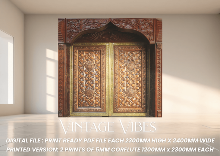 Available as a print-ready PDF file (2300mm high x 2400mm wide) or as a printed version on two 5mm corflute panels (each 1200mm x 2300mm), this design effortlessly transforms your space into a grand, nostalgic experience.
